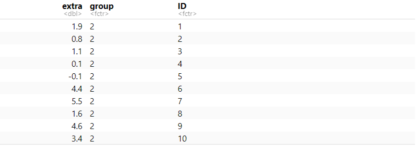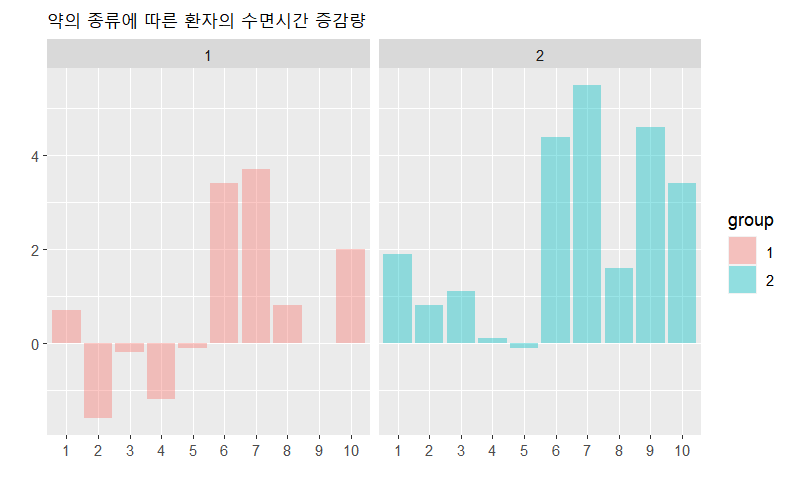 · x축 ID, y축 extra, fill = extra를 사용해 환자별로 복용한 약에 따른 수면시간의 증감을 bar chart로 그릴 수 있음