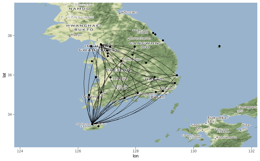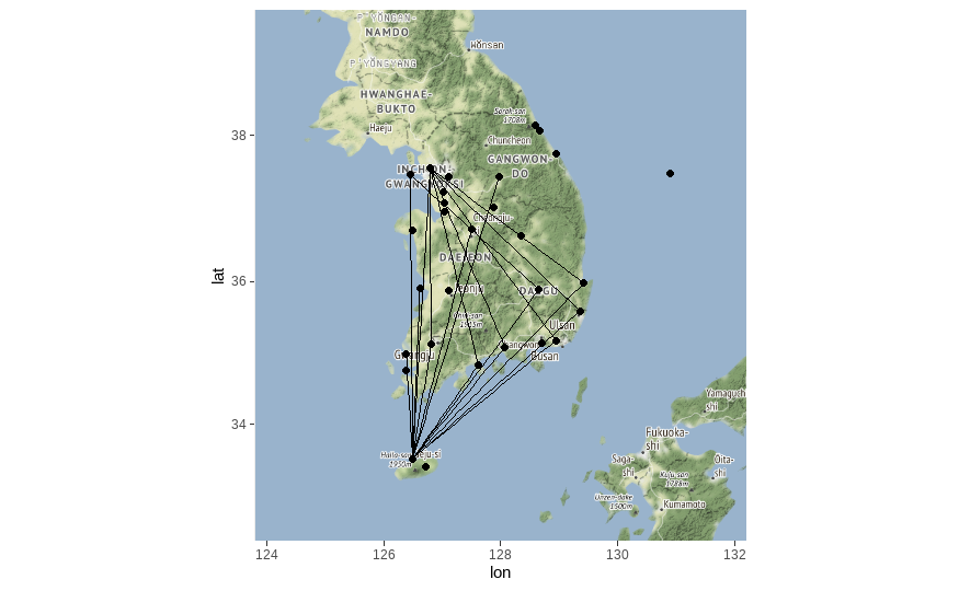 이번 포스팅에서는 역시 ggmap 패키지와 geom_line(ggplot2)을 사용하여