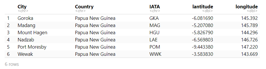 names(airport) <- c("City", "Country", "IATA", "lantitude","longitude")