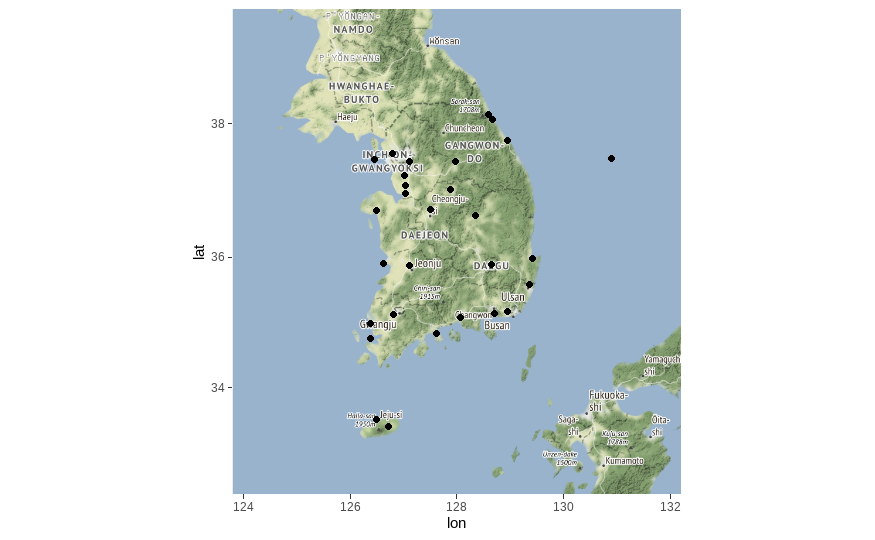 map <- map + geom_point(data=airport.kr, aes(x=longitude, y=lantitude))