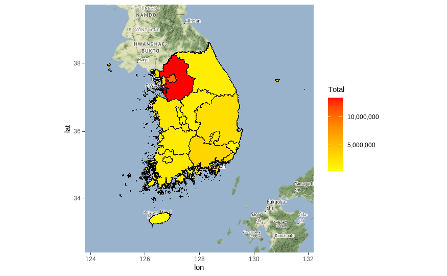 이번 포스팅에서는 ggmap 패키지와 geom_polygon(ggplot2)을 사용하여