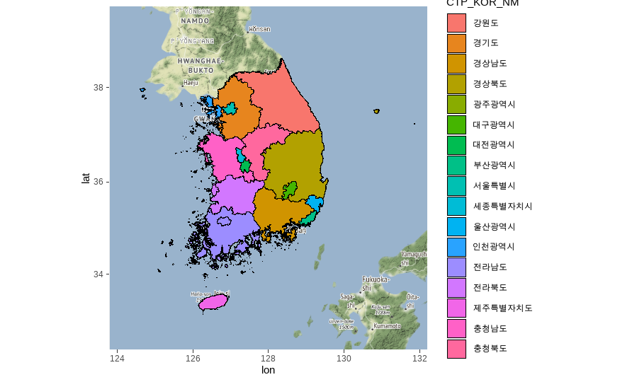 ### polygon(시도별로 색상 다르게) : ggplot()+geom_polygon()