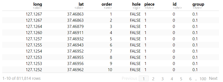 - shp file 데이터 프레임으로 변환 : fortify() 함수 사용