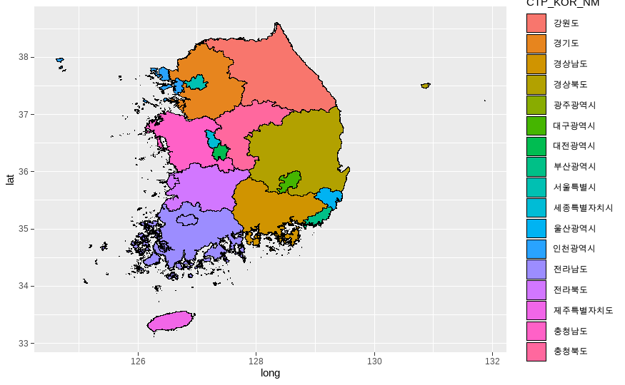 - 시도별로 색상 달리하여 polygon 시각화(fill = 범주형 변수)