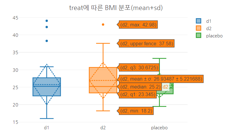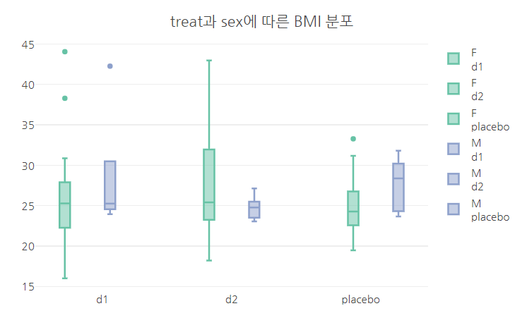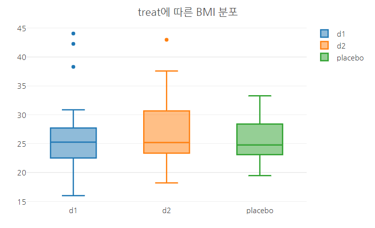 - treat에 따른 환자의 BMI 분포를 보기 위해서 x축에 treat(범주형) 변수를 y축에 BMI(연속형) 변수를 매핑한 후,