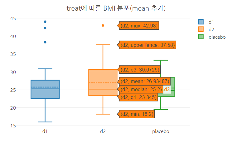 layout(title = "treat에 따른 BMI 분포(mean 추가)",