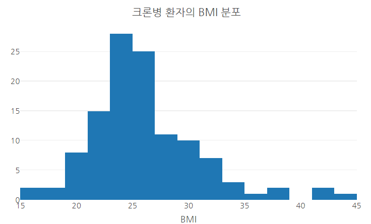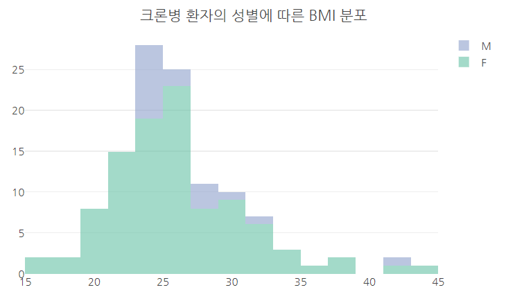 · 크론병 환자의 성별에 따른 BMI 분포를 누적 히스토그램으로 표현