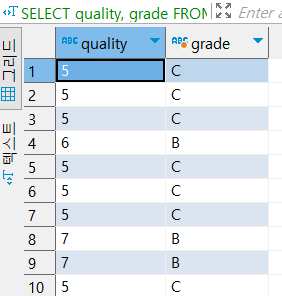 · 와인 품질 데이터 셋에서 'quality' 변수가 3~5이면 'C', 6~7이면 'B' , 8~9이면 'A' 등급 부여