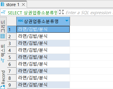 WHERE 상권업종소분류명 = '라면김밥분식'