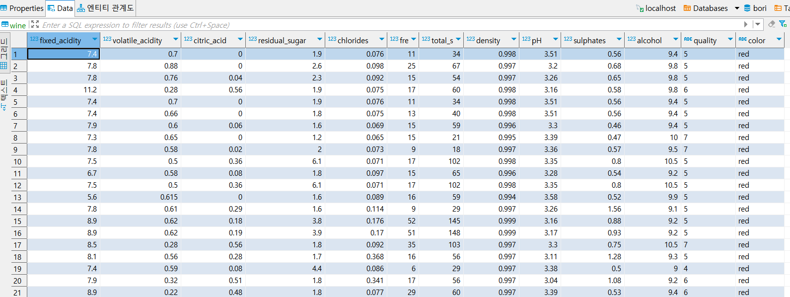 · fixed_acidity의 평균을 서브쿼리를 통해 계산한 후, fixed_acidity의 평균 이상인 값들을 평균값으로 대체