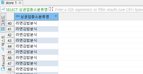 WHERE 상권업종소분류명 = '라면김밥분식';
