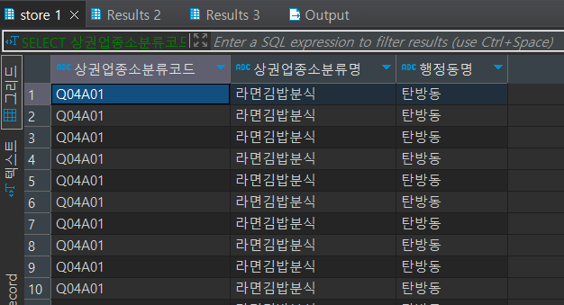 SELECT 상권업종소분류코드, 상권업종소분류명, 행정동명 FROM store