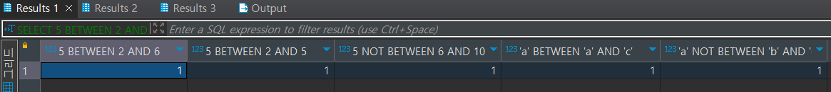 | NOT BETWEEN min AND max | 값이 min과 max값 사이가 아닌 곳에 있음 |