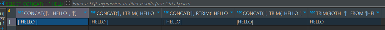 CONCAT('|', TRIM(' HELLO '), '|'),