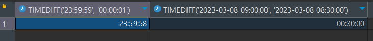 TIMEDIFF('2023-03-08 09:00:00', '2023-03-08 08:30:00');