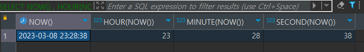 HOUR(NOW()), MINUTE(NOW()), SECOND(NOW());