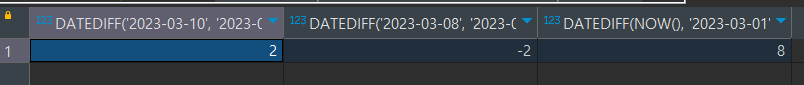 SELECT DATEDIFF('2023-03-10', '2023-03-08'),