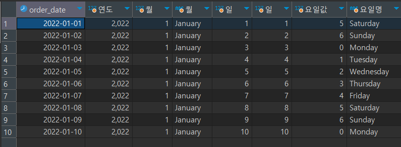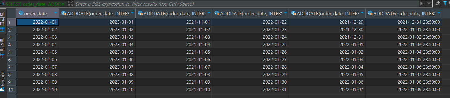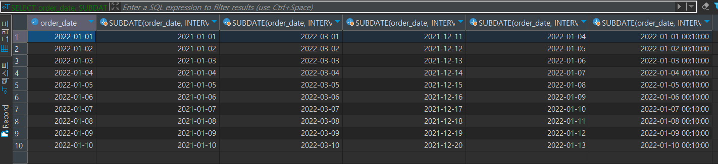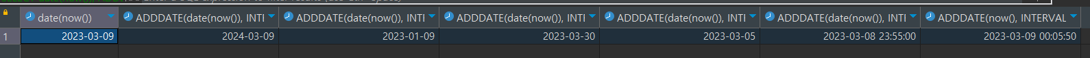 - unit : 'MICROSECOND, SECOND, MINUTE, HOUR, DAY, WEEK, MONTH, QUARTER, YEAR가 올 수 있음.