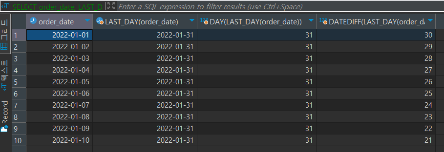 - LAST_DAY(date) : 입력된 날짜의 월의 마지막 날짜를 반환