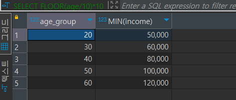 - MIN( ) : 그룹의 특정 컬럼 값 중 최소값을 반환