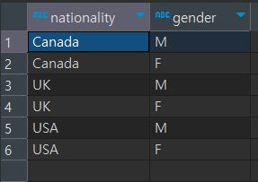 (1, 'Alice', 'F', 25, 'USA', 50000),