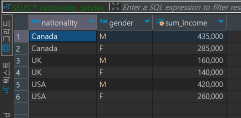 ✔️ 국적, 나이별 총소득 중 총소득이 200,000 이상인 행 추출