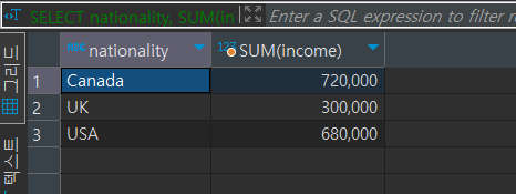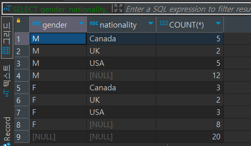 GROUP BY는 nationality가 내림차순으로 정렬되어 있지만 DISTINCT를 썼을 경우는 정렬이 되어 있지 않음