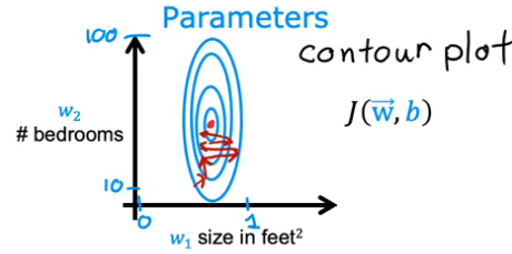 : 비용함수는 길쭉한 타원 형태를 띠게 되며, Gradient Descent가 최적점(global minimum)으로 이동할 때