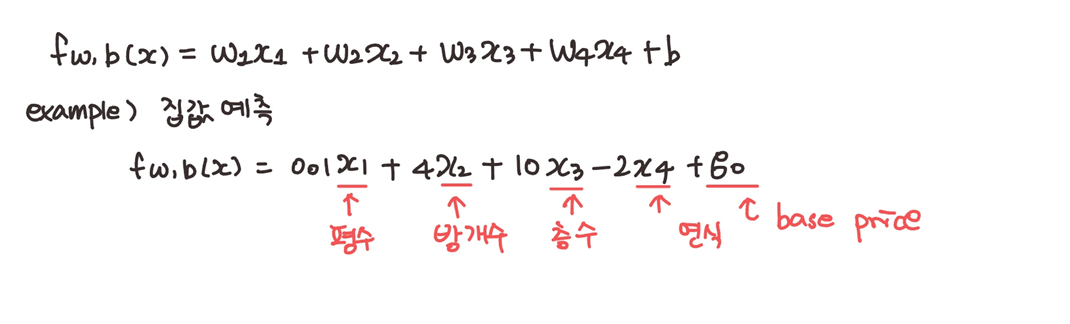 - feature가 늘어나면 w도 늘어나며, 즉 파라미터(학습해야 하는 값)가 여러 개가 됨.